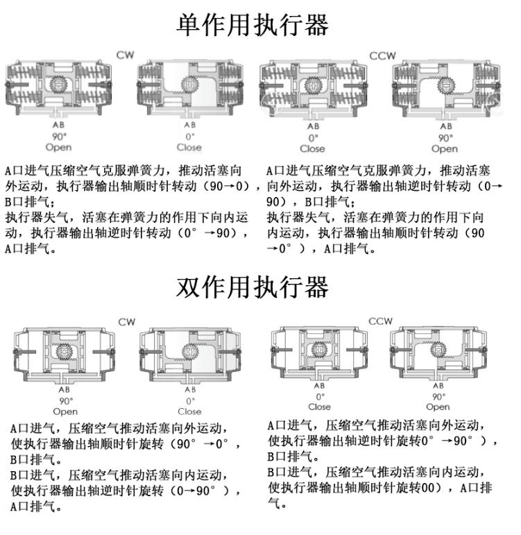 氣動執行器是用氣壓力驅動啟閉或調節閥門的執行裝置,又被稱氣動執行機構或氣動裝置,不過一般通俗的稱之為氣動頭。氣動執行器有時還配備一定的輔助裝置。常用的有閥門定位器和手輪機構。閥門定位器的作用是利用反饋原理來改善執行器的性能,使執行器能按控制器的控制信號,實現準確的定位。手輪機構的作用是當控制系統因停電、停氣、控制器無輸出或執行機構失靈時,利用它可以直接操縱控制閥,以維持生產的正常進行。